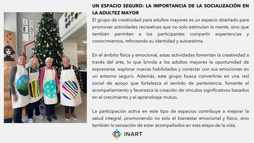 Descubre una experiencia única con nuestro programa 'Club de Creatividad Adulto Mayor', pensado para quienes desean crecer, expresarse y conectar con su creatividad. Este curso se imparte en modalidad presencial y tiene una duración de un mes. Las sesiones se desarrollan los Lunes y/o Jueves 10am-12:30pm, en un ambiente diseñado para inspirarte y potenciar tu talento.